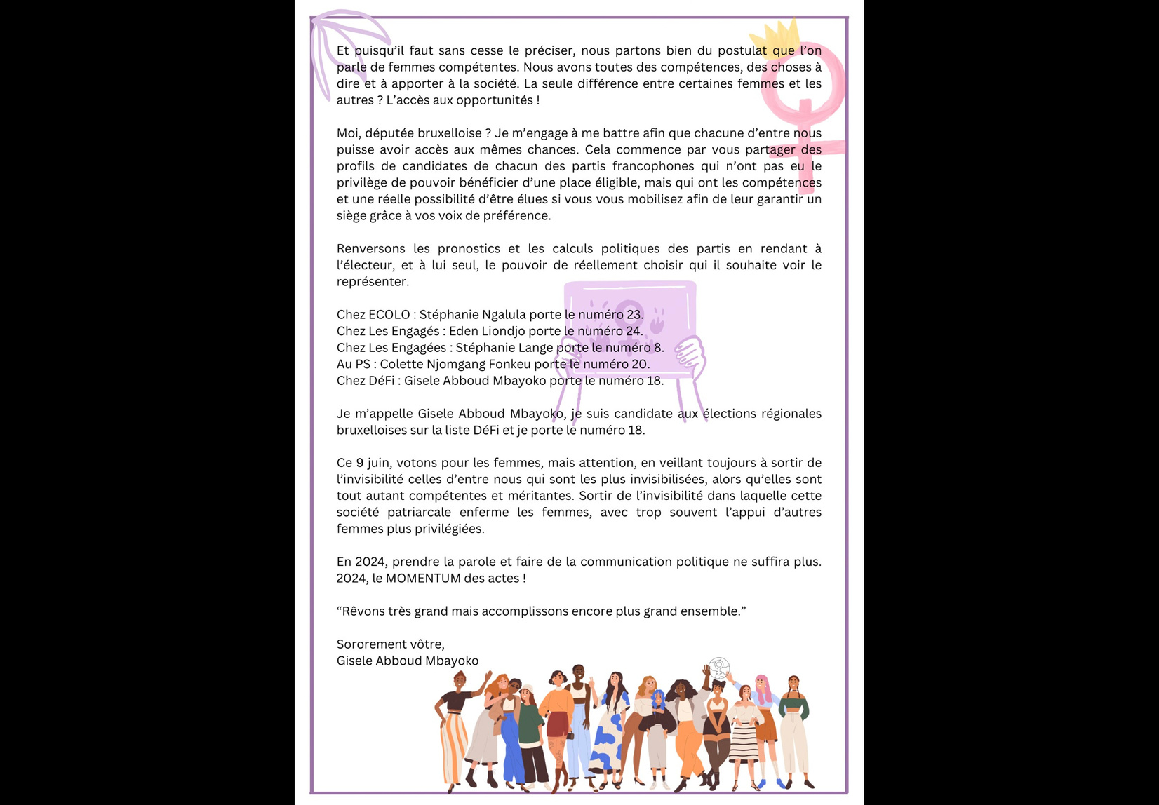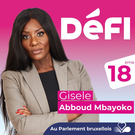 Faites-moi confiance et encouragez vos proches à voter Gisele Abboud Mbayoko, candidate numéro 18 sur la liste DéFI au parlement bruxellois.